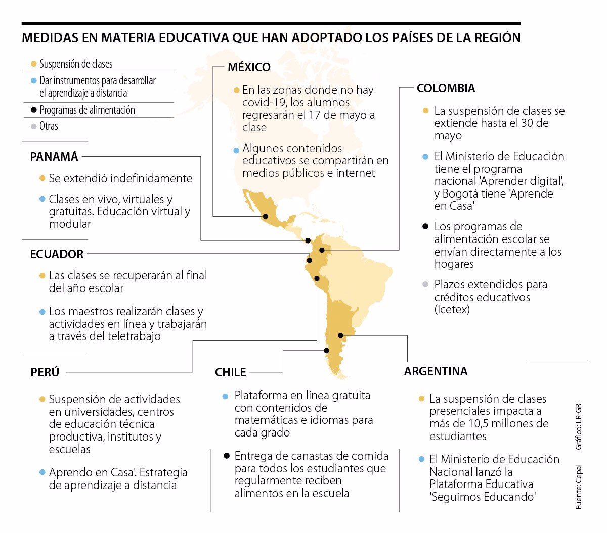 En Colombia se han adoptado seis medidas en total en los últimos dos meses, mientras que en Chile se han dado a conocer cinco, entre las que se encuentran algunas similares a las de Colombia. Allí suspensión de clases, se impulsó la digitalización del aprendizaje y se mantuvo el programa de alimentación (incluye desayuno y almuerzo) será llevado hasta la casa de cada alumno.